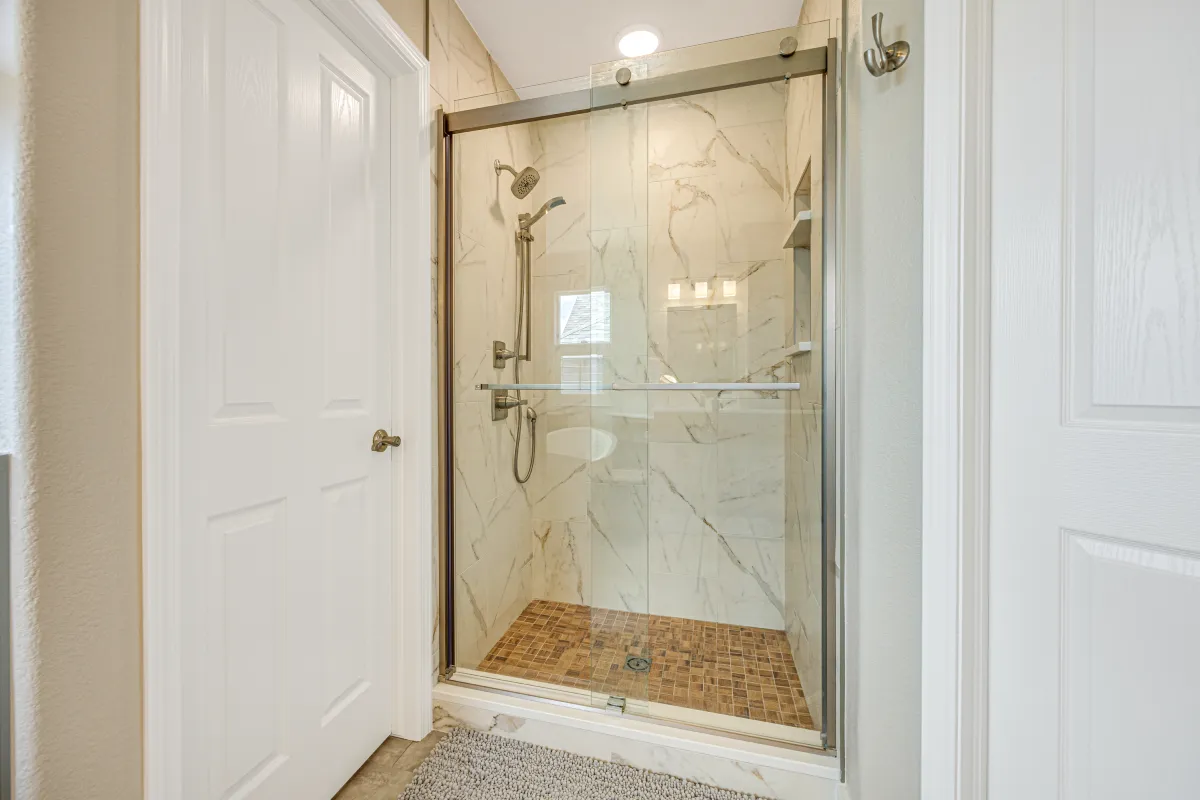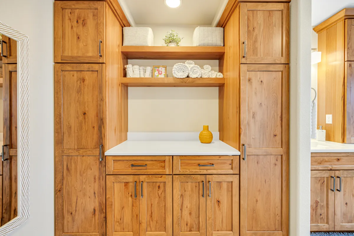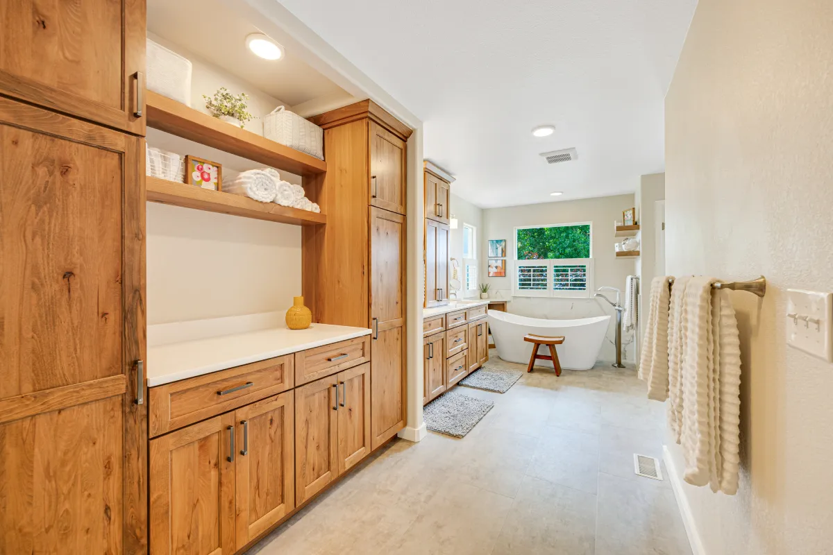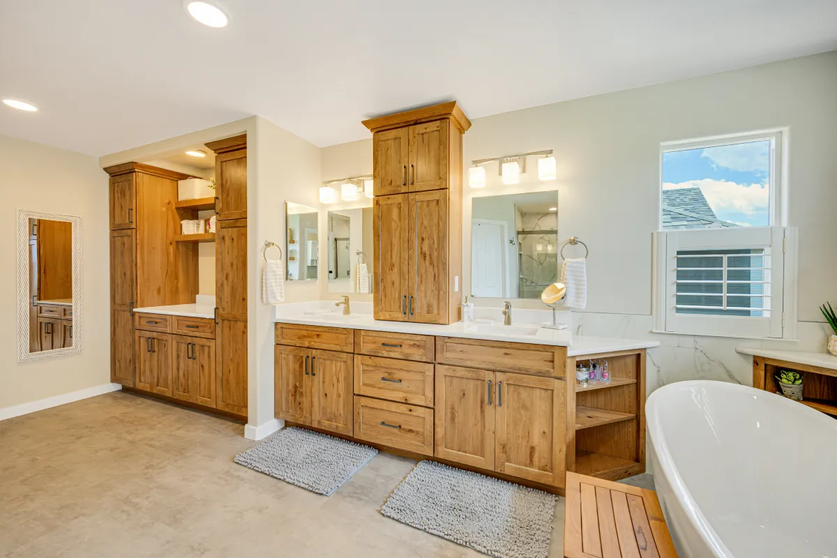 Springs Home Improvement completed a stunning bathroom remodel in the Sky King neighborhood, designed with both luxury and practicality in mind. This spacious bath retreat now features an abundance of custom wood cabinetry, offering generous storage without compromising on style. The sleek hardware adds a modern touch, perfectly complementing the warm tones of the natural wood and enhancing the overall aesthetic.