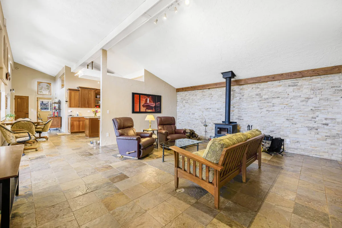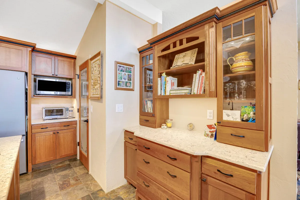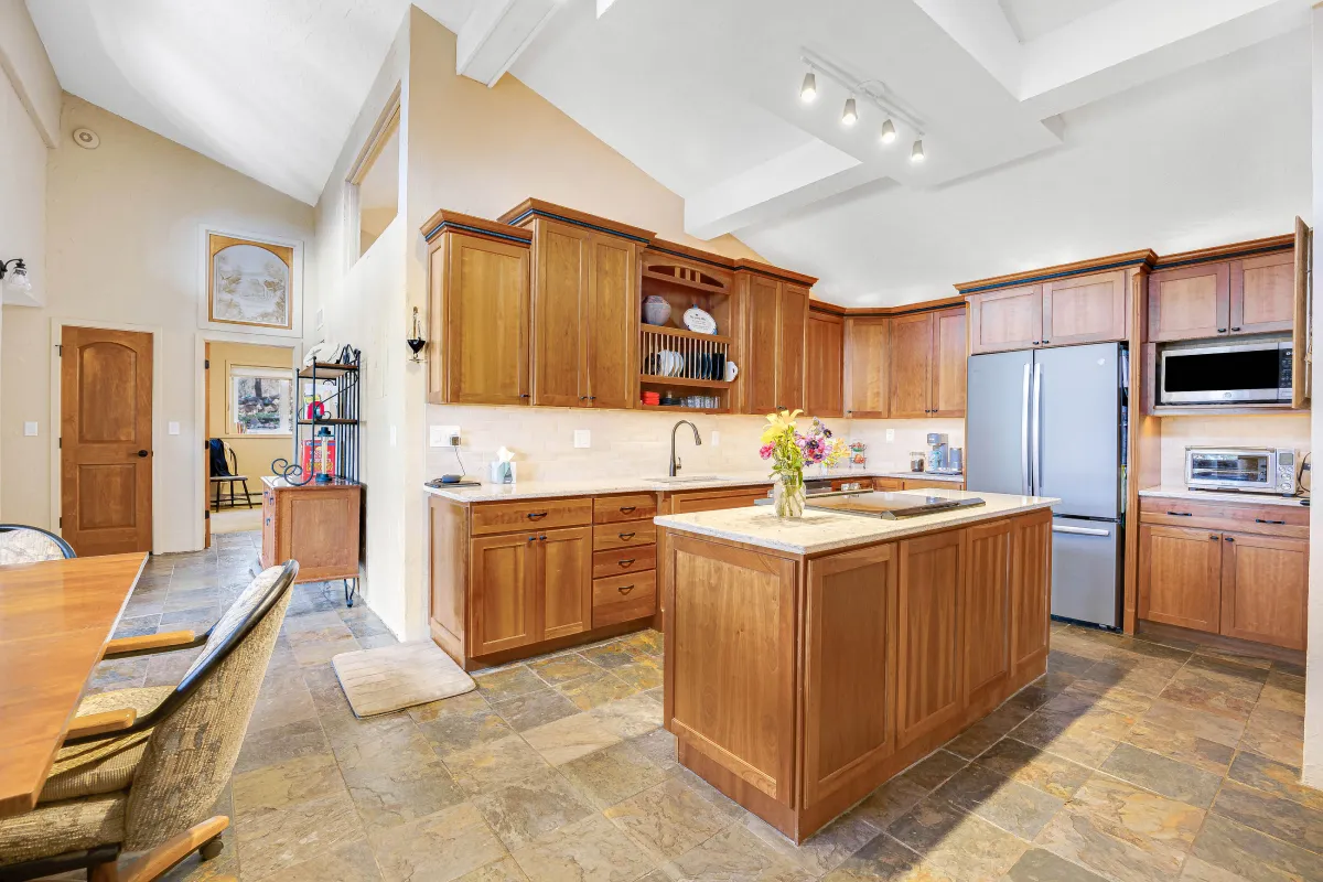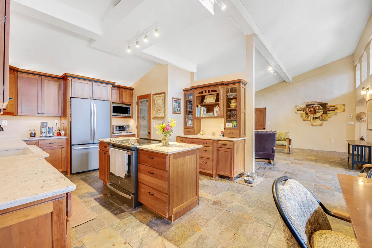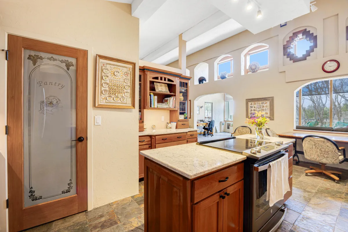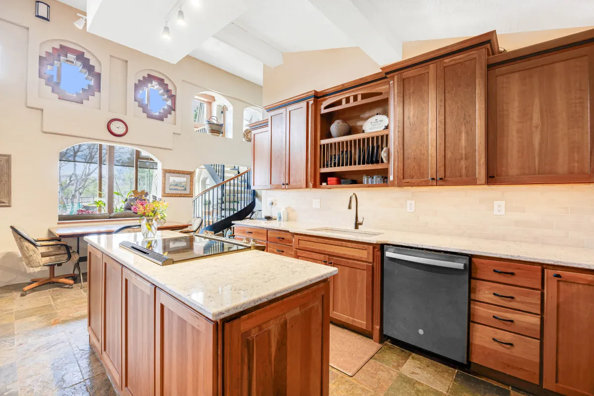 The heart of the home now radiates with natural light, thanks to a spectacular wall of windows in the sunroom that brings the outdoors in. Slate tile flooring flows throughout the main areas, tying the spaces together with warmth and texture. The living room’s architectural details—including arched niches, exposed beams, and custom iron stair railings—enhance the home’s unique Southwestern character while creating cozy, inviting spaces for relaxation and gathering.